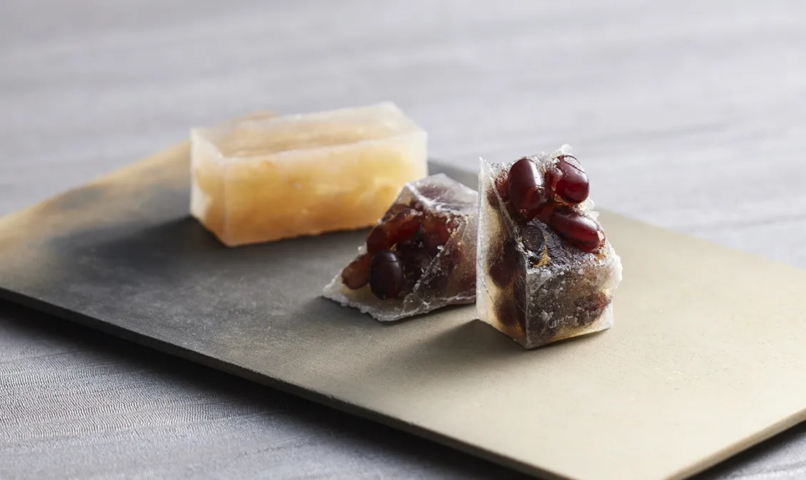 花かずらは長い歳月を経た石垣の風合いを大納言小豆で、その石垣に咲く蔓の花を琥珀の輝きで表した和菓子です。