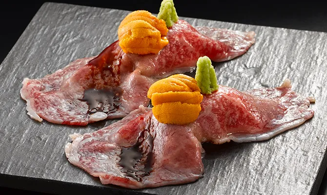 霜降り和牛と生うに炙り寿司
